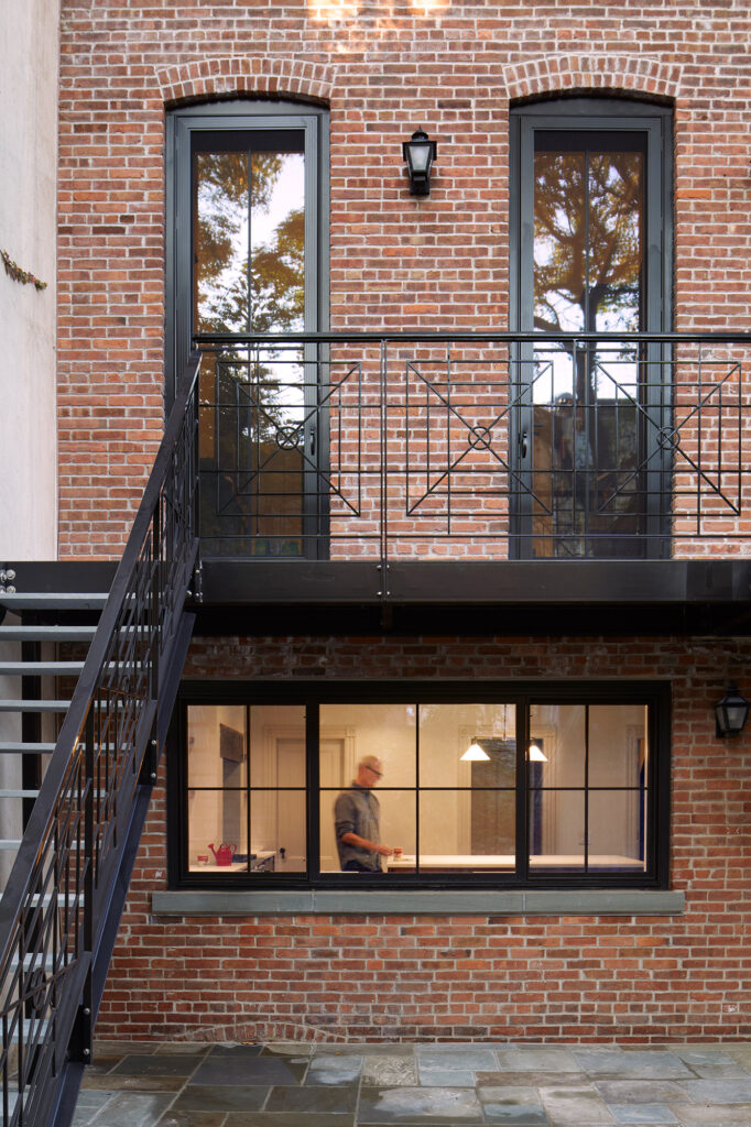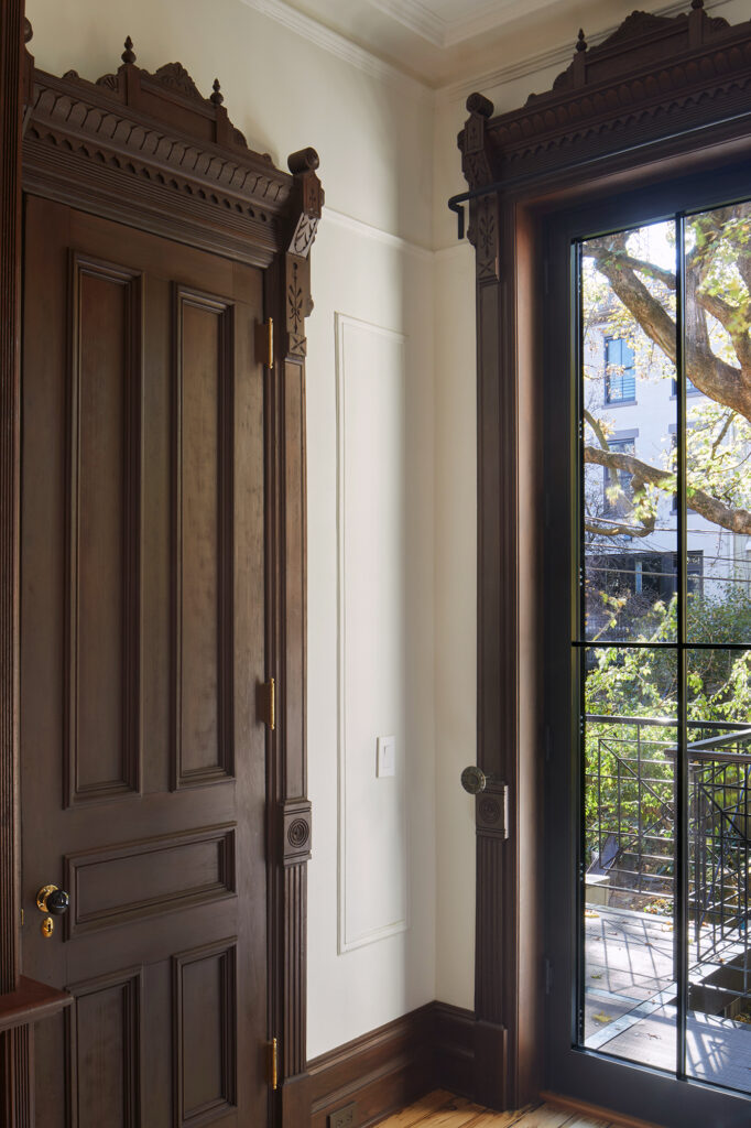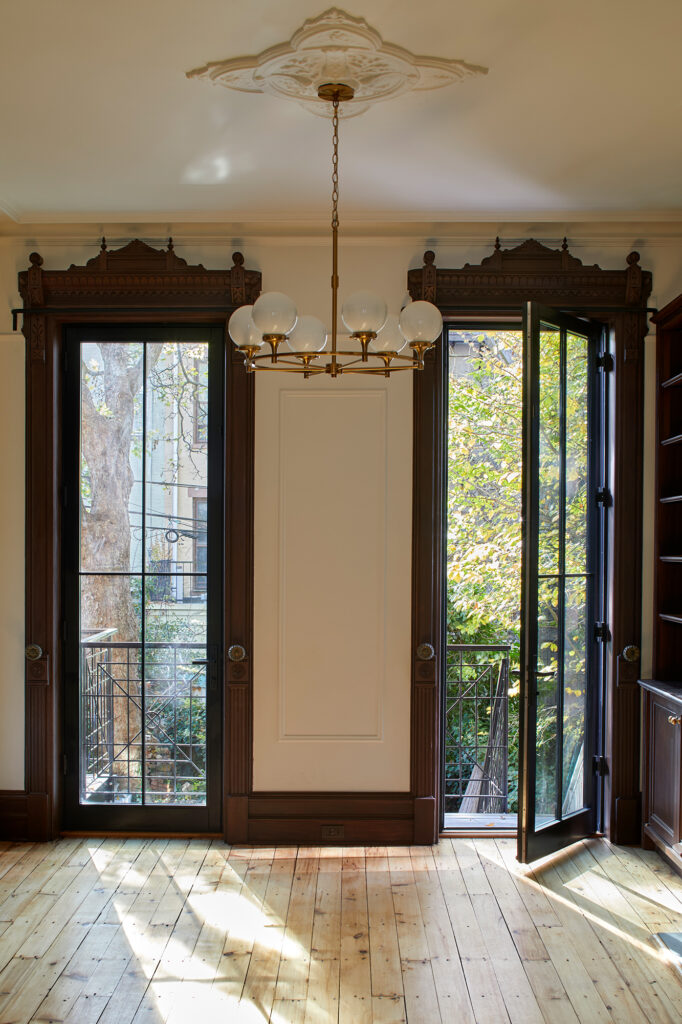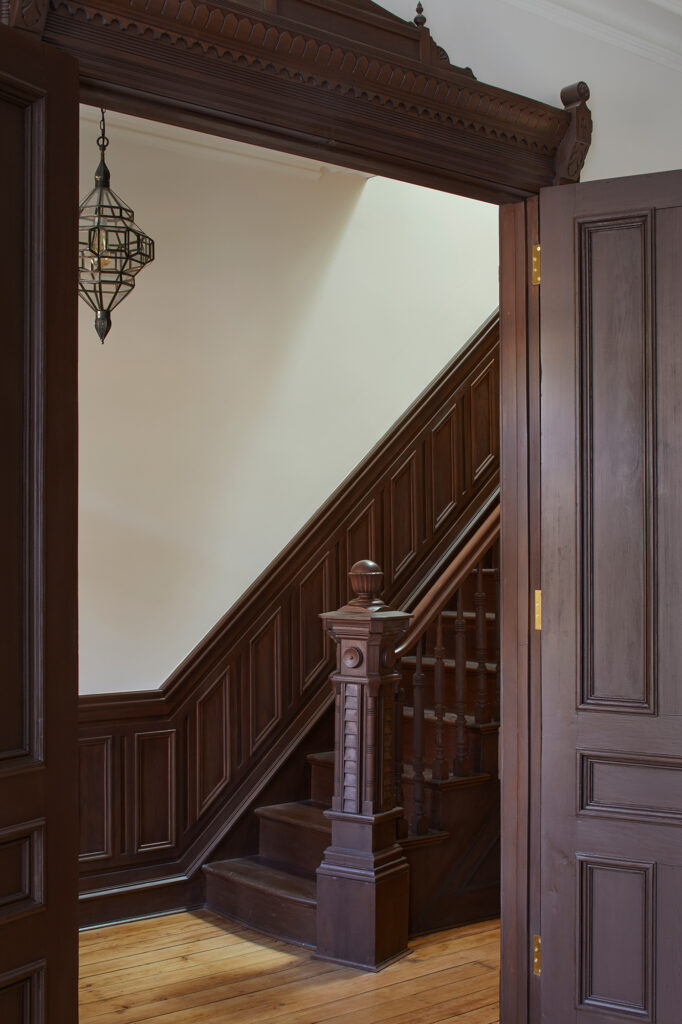 The rear facade masonry restoration, new wood windows/doors and deck improves the relationship with the rear yard. The interior’s ornate details, dark wood trim, light pine floors and plaster walls have been preserved, while new services have been installed without interrupting the spaces.