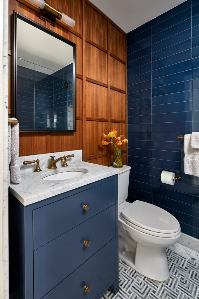 Through the use of natural materials, color and texture the spaces in the private zone have their own personality. The four bedrooms each received a thoughtful amount of storage and work space through the custom design cabinetry. The bathrooms continue this exploration with deep blue tile and natural walnut in one, and floral paper and natural stone in another.